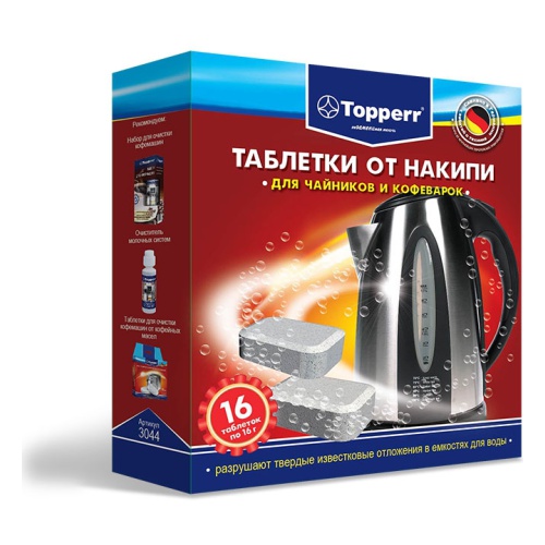 Таблетки TOPPERR для удаления накипи разрушают твердые известковые отложения в емкостях для воды, кофейных аппаратах или чайниках. Регулярное применение увеличивает срок службы приборов.