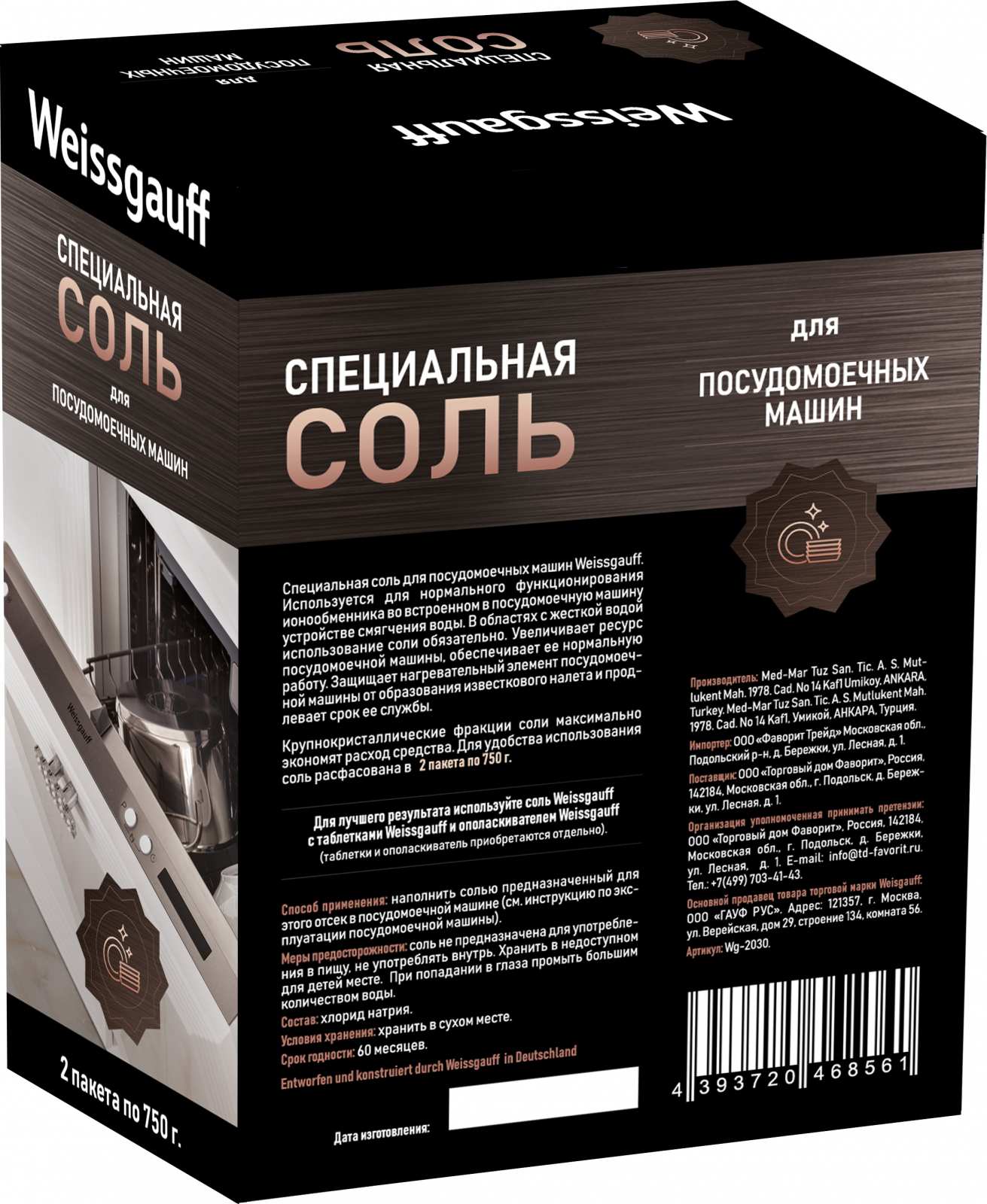 Специальная соль для посудомоечных машин Weissgauff. Используется для нормального функционирования ионообменника во встроенном в посудомоечную машину устройстве смягчения воды. В областях с жесткой водой использование соли обязательно. Увеличивает ресурс посудомоечной машины, обеспечивает ее нормальную работу. Защищает нагревательный элемент посудомоечной машины от образования известкового налета и продлевает срок ее службы. Крупнокристаллические фракции соли максимально экономят расход средства. Для удобства использования соль расфасована в 2 пакета по 750 г. Для лучшего результата используйте соль Weissgauff с таблетками Weissgauff и ополаскивателем Weissgauff (таблетки и ополаскиватель приобретаются отдельно). Способ применения: наполнить солью предназначенный для этого отсек в посудомоечной машине (см. инструкцию по эксплуатации посудомоечной машины). Меры предосторожности: соль не предназначена для употребления в пищу, не употреблять внутрь. Хранить в недоступном для детей месте. При попадании в глаза промыть большим количеством воды. Состав: хлорид натрия. Условия хранения: хранить в сухом месте. Срок годности: см. на упаковке.