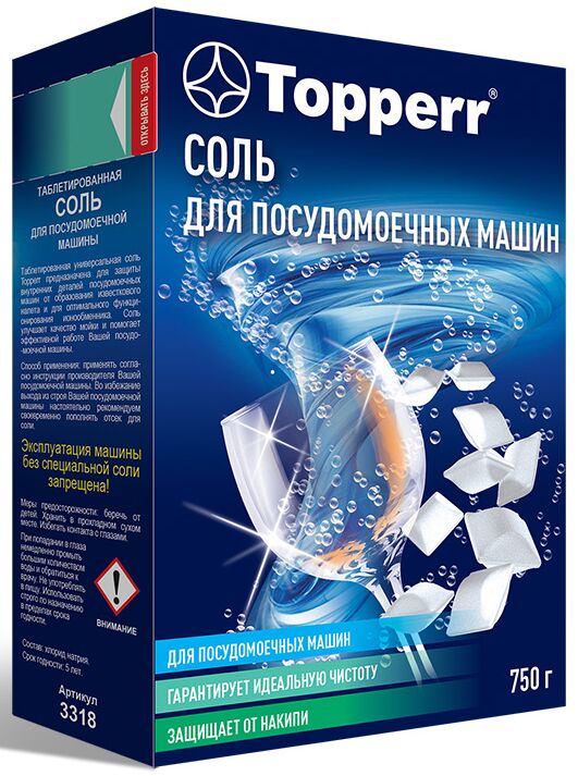 Таблетированная универсальная соль Topperr предназначена для защиты внутренних деталей посудомоечных машин от образования известкового налета и для оптимального функционирования ионообменника. Соль улучшает качество мойки и помогает эффективной работе Вашей посудомоечной машины.