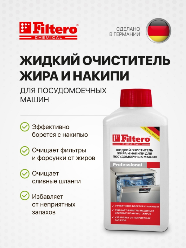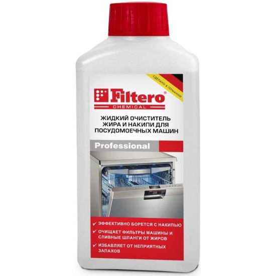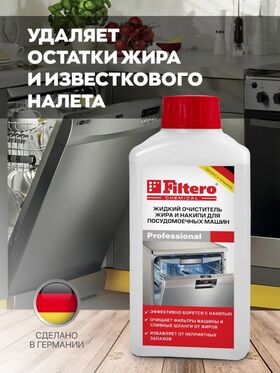 Жидкий очиститель для посудомоечных машин Filtero удаляет любые загрязнения с внутренних деталей посудомоечных машин.