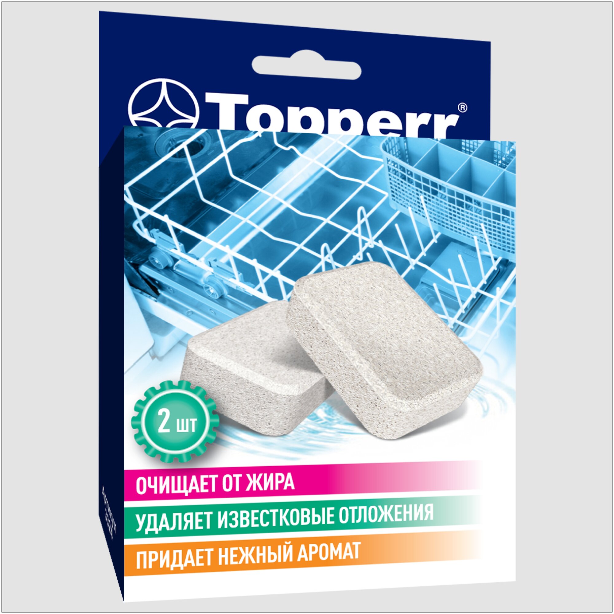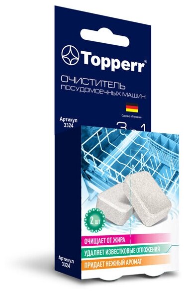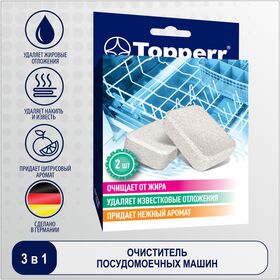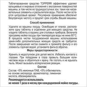 таблетированное средство TOPPERR предназначено для быстрого и эффективного удаления накипи и жировые отложения с нагревательных элементов и внутренних деталей посудомоечных машин; после чистки остается цитрусовый аромат; регулярное применение обеспечит безупречную чистоту и продлит срок службы Вашей машины