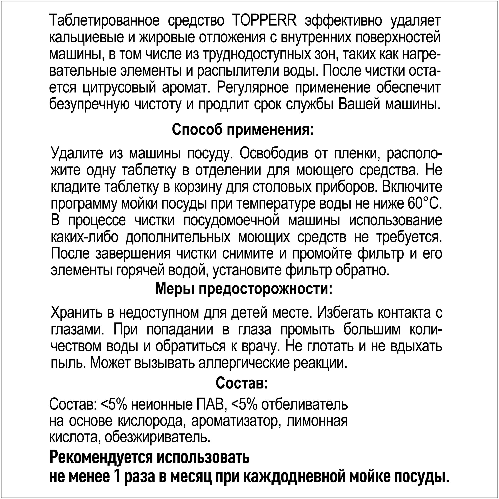 Очиститель посудомоечных машин (таблетированный) 3324 Таблетированное средство TOPPERR предназначено для быстрого и эффективного удаления накипи и жировых отложений с нагревательных элементов и внутренних деталей посудомоечных машин. После чистки остается цитрусовый аромат. Регулярное применение обеспечит безупречную чистоту и продлит срок службы Вашей машины. Способ применения: Удалите из машины посуду. Освободив от пленки, расположите одну таблетку в отделении для моющего средства. Не кладите таблетку в корзину для столовых приборов. Включите программу мойки посуды при температуре воды не ниже 60°C. В процессе чистки посудомоечной машины использование каких-либо дополнительных моющих средств не требуется. После завершения чистки снимите и промойте фильтр и его элементы горячей водой, установите фильтр обратно.