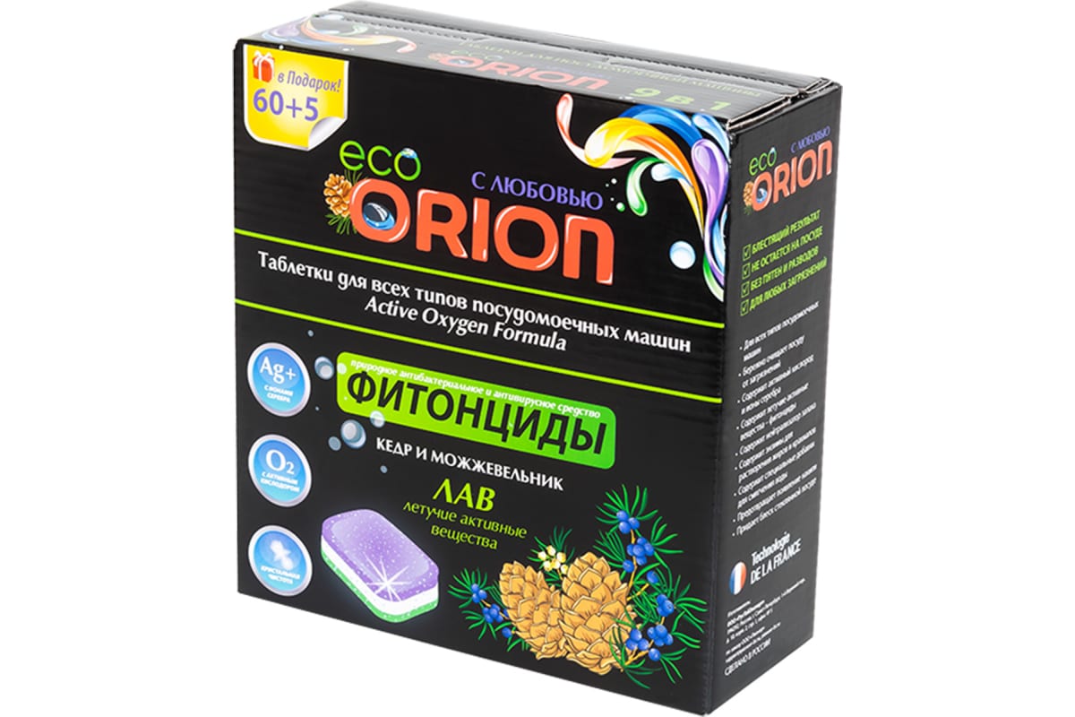 Таблетки для посудомоечной машины ORION с фитонцидами, ионами серебра и активным кислородом эффективно и бережно очищают посуду от любых загрязнений, придают блеск и чистоту.