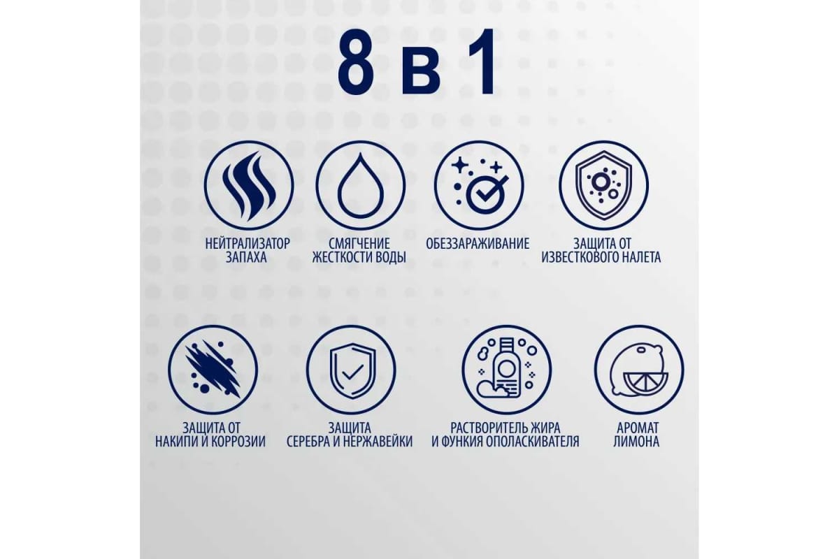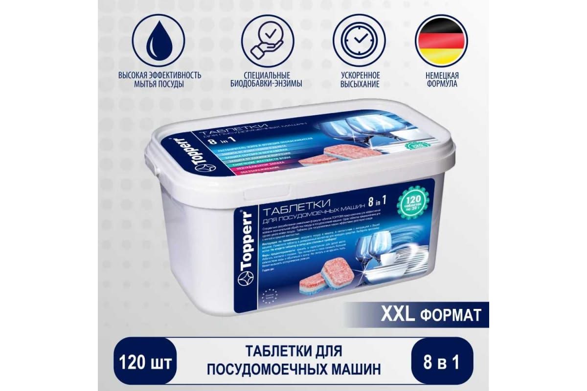 Таблетки для мытья посуды в посудомоечной машине со специальной высокоэффективной формулой для исключительного блеска. Средство многофункционально. Оно выступает как регенерирующая соль, ополаскиватель.