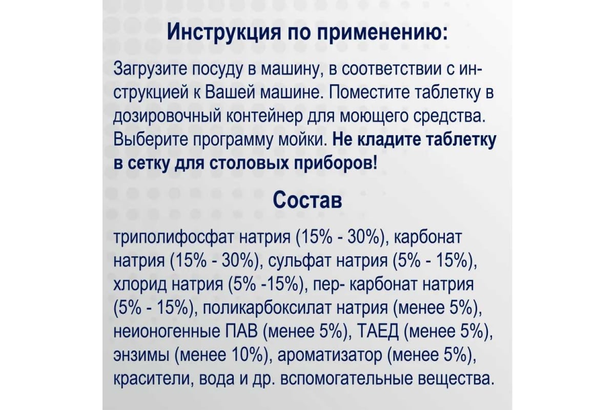 Способ применения: Загрузите посуду в машину, в соответствии с инструкцией к машине. Поместите таблетку в дозировочный контейнер для моющего средства. Выберите программу мойки.