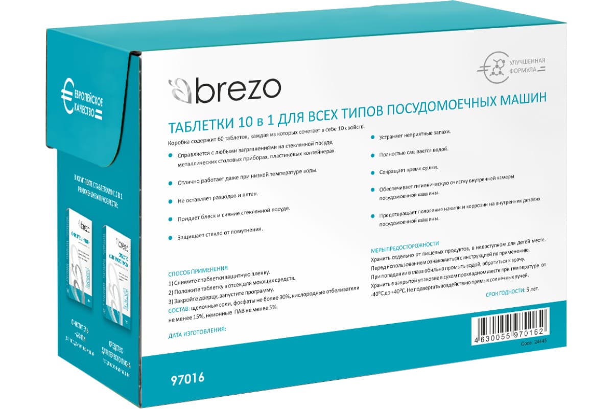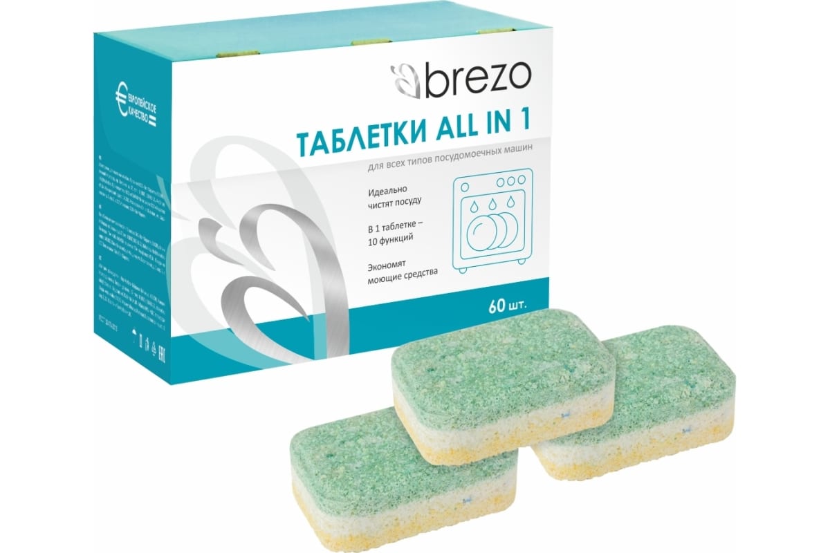 Таблетки для посудомоечной машины BREZO ALL IN 1 97016 в коробке, содержит 60 таблеток.