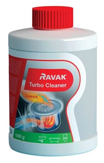 Насыпьте в раковину 30 – 90 г средства, залейте 0,1 – 0,4 л горячей воды (в зависимости от количества средства), оставьте как минимум на 30 мин, а потом смойте горячей водой. Внимание: Остерегайтесь контакта средства RAVAK TurboCleaner с кожей!