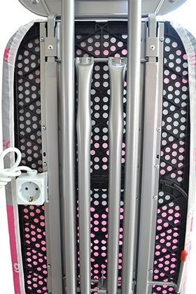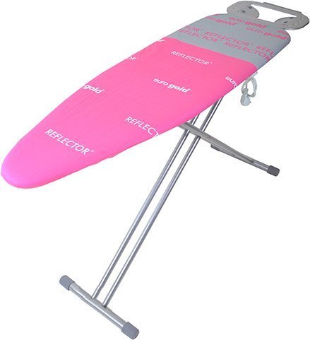 Гладильная доска Eurogold. Она имеет стандартный размер столешницы 120 х 38 см, которая сделана из перфорированного пластика. Термопластик, которым оснащена гладильная доска очень устойчив к высоким температурам. Благодаря пластику доска стала намного легче и устойчивее. На основания ножек одеты колпачки, предохраняющие доску от скольжения.