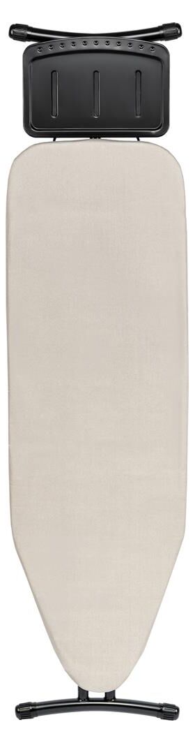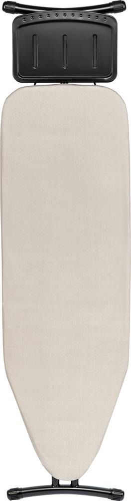 Размер гладильной поверхности 122*38см, сетка, чехол из хлопка с антипригарным покрытием 180г/м2, поролон 2мм, войлок 2мм (плотность 175г/м2), PET, поролон (цвет графит) 3мм, стопер с кнопкой.