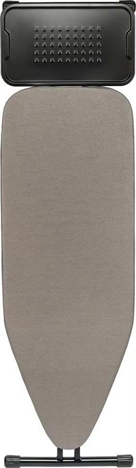 Размер гладильной поверхности 122*43см, сетка, чехол из хлопка с антипригарным покрытием 180г/м2, поролон 2мм, войлок 2мм (плотность 175г/м2), PET, поролон (цвет графит) 3мм, стопер с кнопкой.
