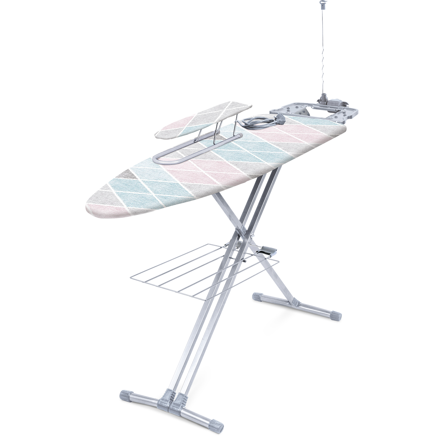 Гладильная доска с электросоединителем и подставкой под утюг, регулируемая по высоте. Удобная полка для белья и переносной подрукавник.