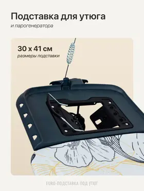 Широкая гладильная доска предназначена для глажки белья. Модель оснащена электросоединителем и эргономичной подставкой под утюг.