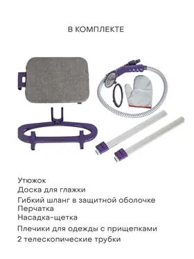 Отпариватель, гибкий шланг, телескопическая стойка, утюжок для отпаривания, перчатка, плечики для одежды, гарантийный талон, руководство по эксплуатации.