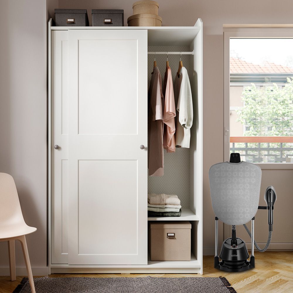 Телескопические стойки складные, а корпус отпаривателя компактный. Такая конструкция позволяет удобно хранить его в комнате или в шкафу.