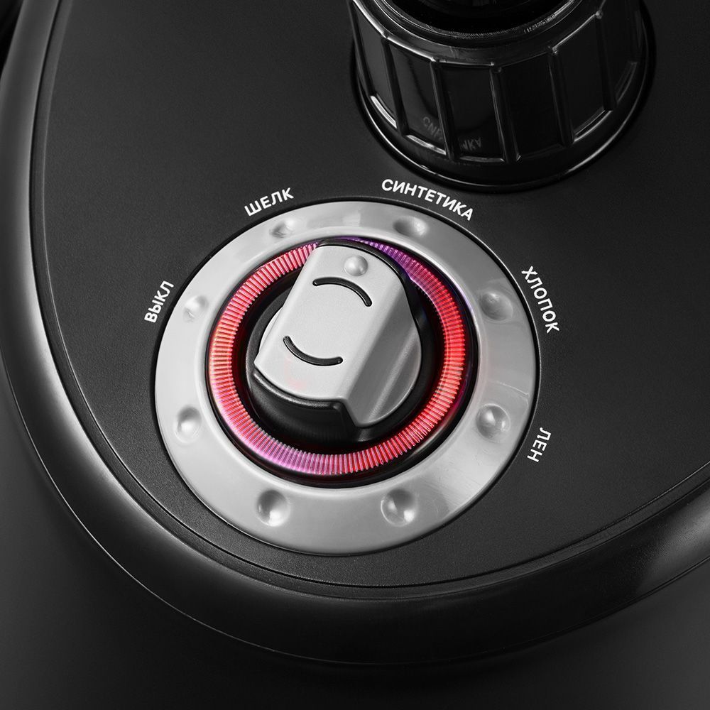 На панели управления располагается регулятор уровня подачи пара и индикатор работы: Шёлк, Синтетика, Хлопок, Лён), где Шёлк – минимальная подача пара, положение Лён – максимальная. Чем плотнее ткань, тем больше пара потребуется для разглаживания.
