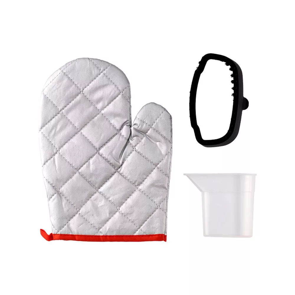 Для удобства наливания воды в резервуар предусмотрен мерный стакан. В комплекте также идет защитная варежка, использование которой делает работу с отпаривателем более комфортной и безопасной.