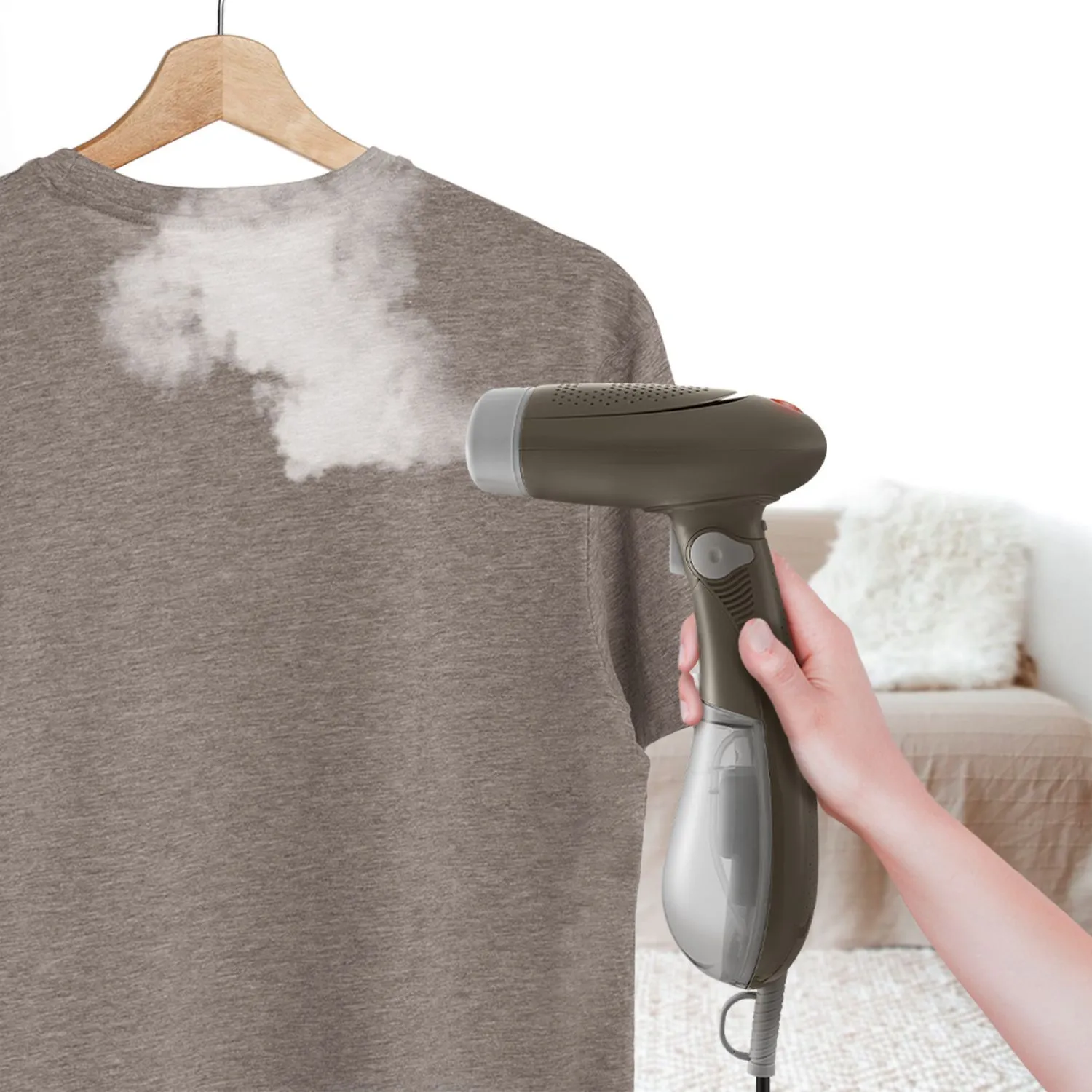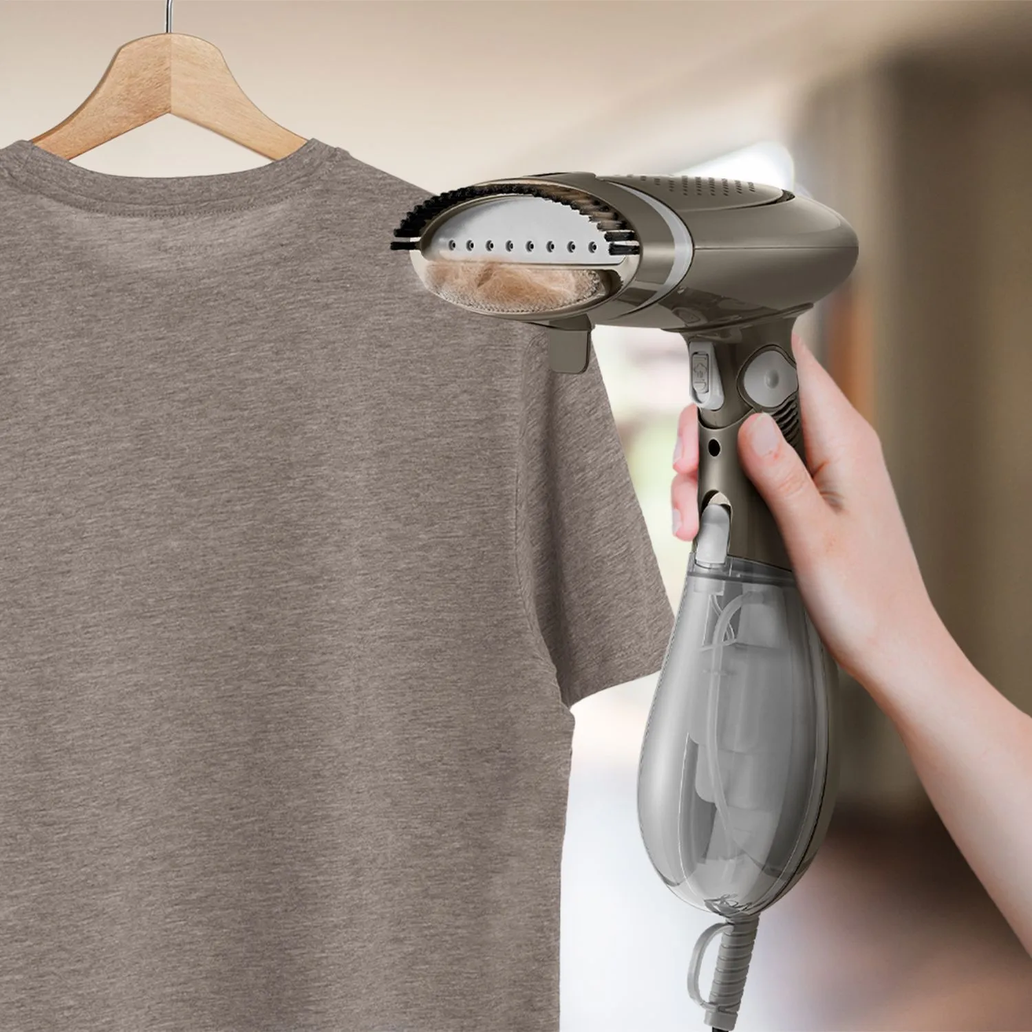 В отпаривателе КТ-9252 управление процессом подачи пара осуществляется с помощью одной кнопки на ручке прибора. Благодаря мощному потоку пара разглаживаются даже те вещи, которые обычно не гладят — платья со сложной структурой, шубы, дублёнки или куртки.