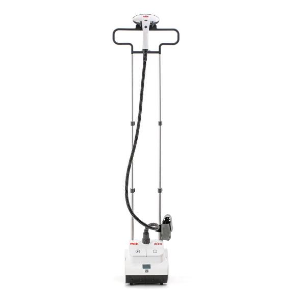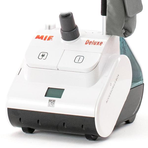 Ручной отпариватель Mie Deluxe выполнен в корпусе белого цвета, оборудован резервуаром для воды емкостью 2,5 л. Прибор работает в трех режимах, интенсивность подачи пара достигает 85 г/мин. Устройство потребляется 2600 Вт энергии, подключается к сети с помощью кабеля длиной 1,7 м. Всего через минуту можно начинать глажку.
