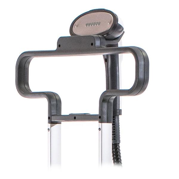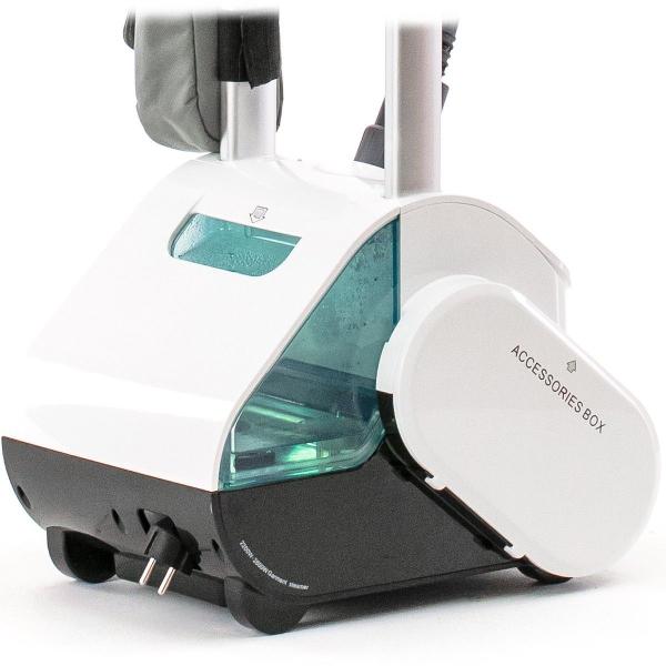 Накопитель для пара выполнен из алюминия, трубка — из термостойкого пластика. В комплекте есть две насадки: стандартная и щетка. Настройки регулируются с помощью механических переключателей, о готовности к использованию сообщает световой индикатор. Для удобного перемещения конструкция снабжена колесами, в корпусе есть отсек для сматывания сетевого шнура.