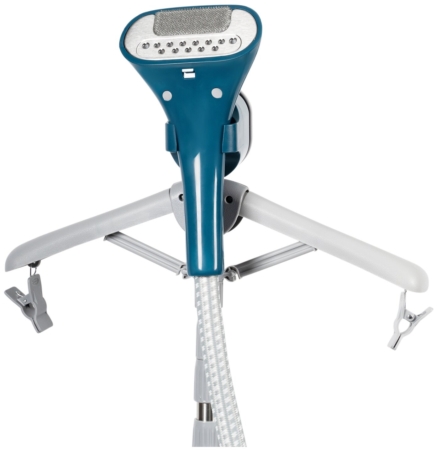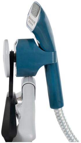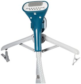 в комплекте: четырехсекционная телескопическая стойка длиной 120 см, теплоизолированный шланг с утюжком для подачи пара длиной 118 см, вешалка, держатели для брюк, подставка для утюжка, насадка-щетка, теплоизолированная рукавица, контейнер для воды