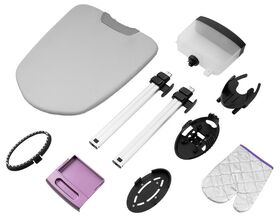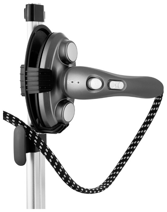 - подогрев утюжка, двойная телескопическая стойка, 2 режима работы: отпаривание и глажка, 3 режима отпаривания, гладильная доска с механизмом наклона, поворотный утюжок, защитная варежка, дренажный поддон, сенсорная панель управления, защитная насадка для деликатных тканей, парковочная площадка для утюжка