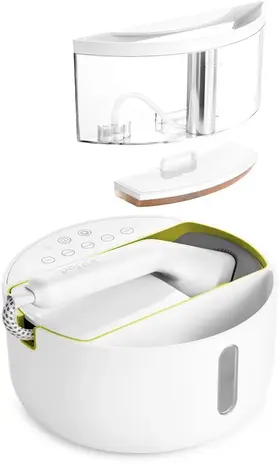 Ёмкость съёмного резервуара составляет 600 мл. Такого объёма хватит примерно на полчаса беспрерывного отпаривания (на 2ом уровне подачи пара). Время нагрева составит 80 сек. Под бачком есть деминерализационный фильтр.