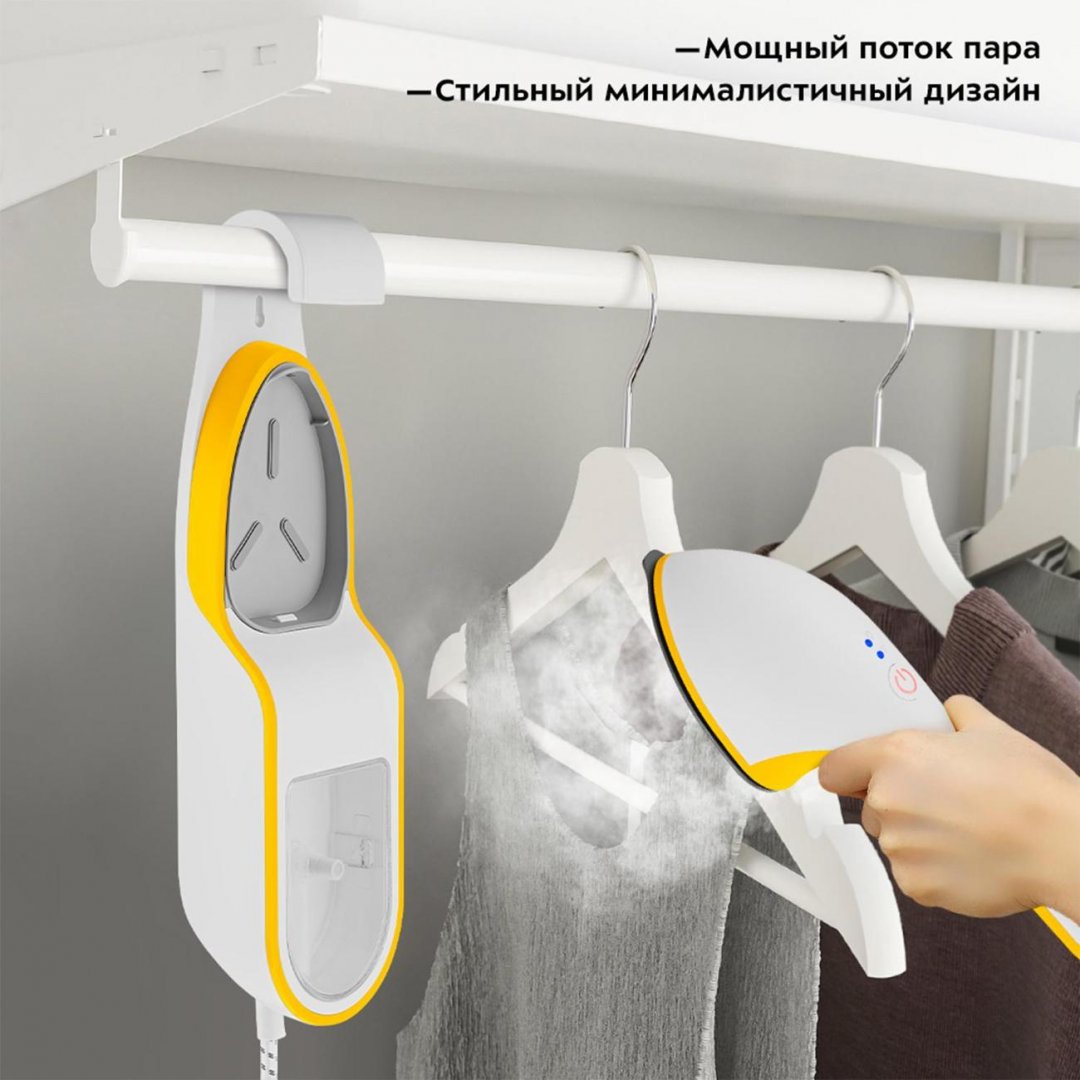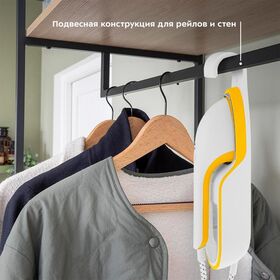 В базе предусмотрено отверстие для настенного крепления, а также крепление на штангу для одежды. 2 в 1: утюг и отпариватель.