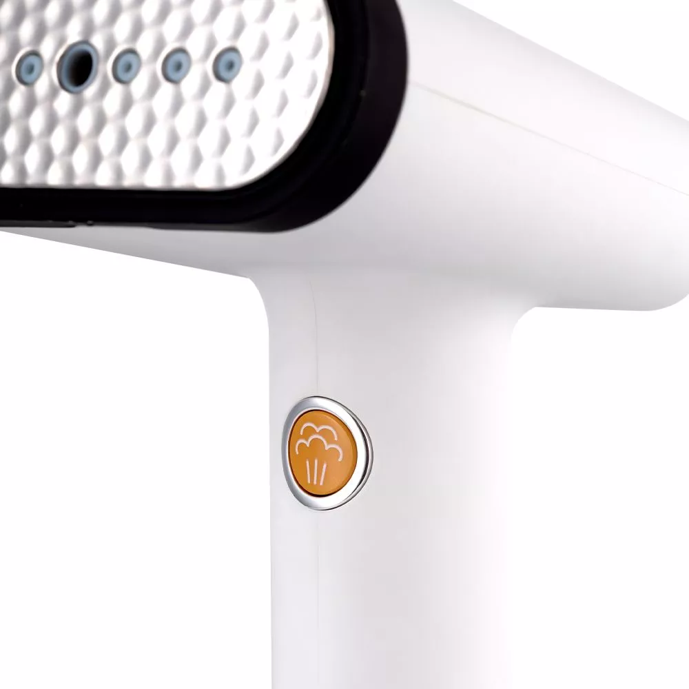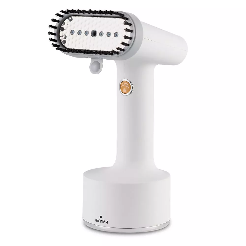 Кнопка подачи пара удобно располагается под пальцем руки, которой вы держите отпариватель. Подача пара осуществляется при нажатии кнопки, удерживать её не нужно. Если вы хотите осуществить сухую глажку, то выключите подачу пара нажатием той же кнопки.