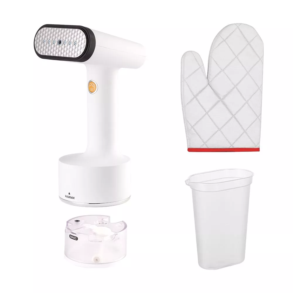 Резервуар для воды ёмкостью 150 мл у отпаривателя съёмный. С помощью мерного стакана, который идёт в комплекте, резервуар легко наполняется водой и устанавливается в корпус прибора. Варежка предназначена для защиты руки от ожога во время отпаривания.