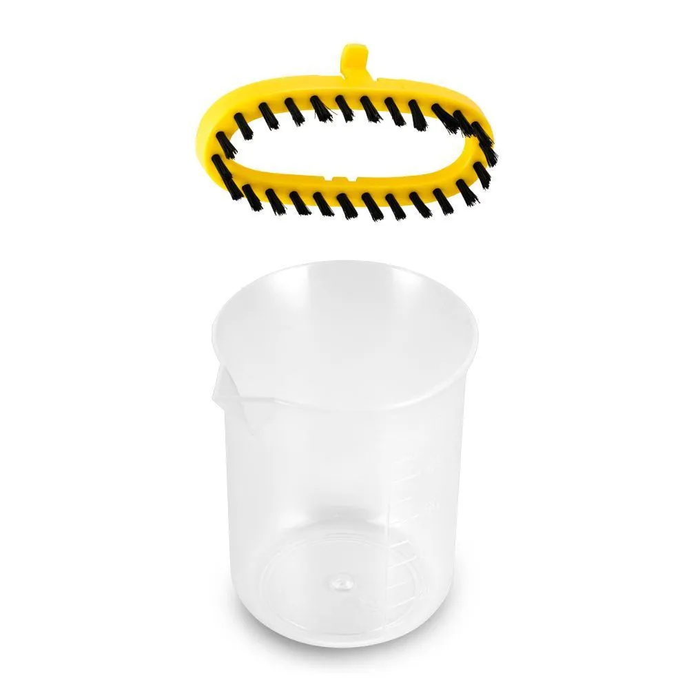 В комплекте к прибору идёт ворсовая щётка, которой легко очищать текстиль от шерсти, ворса и волос. Помимо щётки с отпаривателем в комплекте идёт мерный стаканчик для удобного залива воды внутрь.