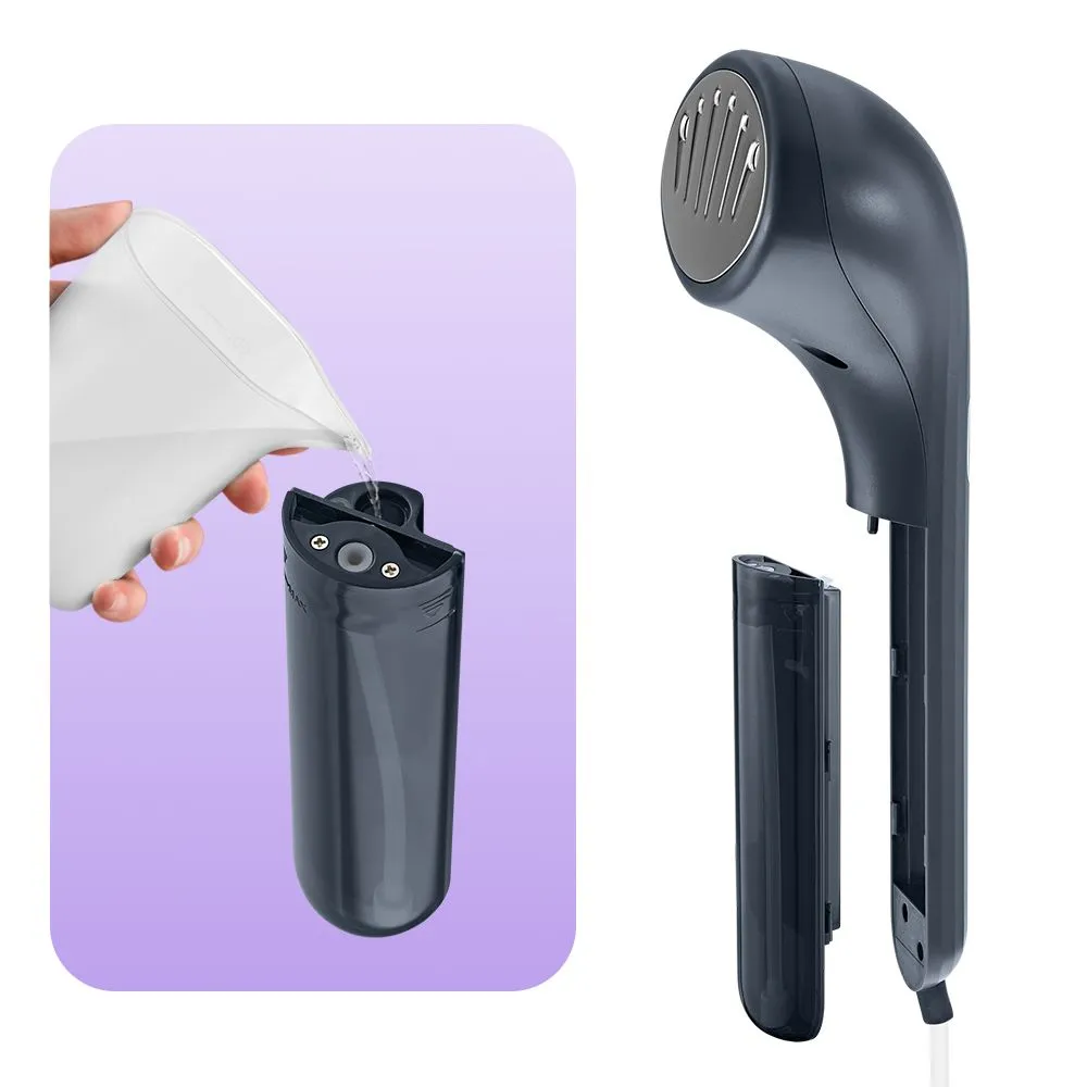 Съёмный резервуар для воды ёмкостью 75 мл оборудован специальным отверстием для залива воды внутрь. Оно защищено заглушкой, чтобы вода не вытекла при работе отпаривателя. В комплекте с устройством идёт мерный стакан.