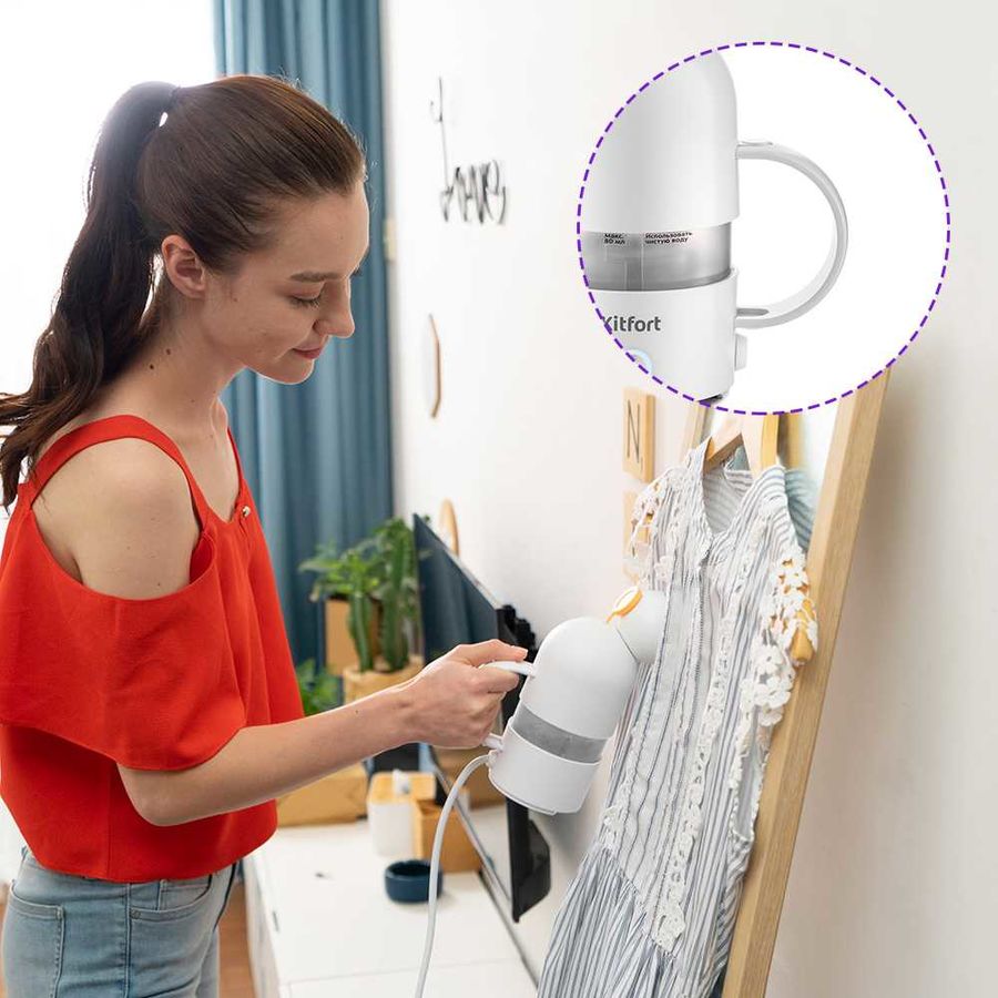 Особенности Все выступающие части отпаривателя снимаются и складываются в отсек, который закрывается стаканом для заливки воды.