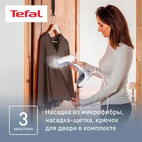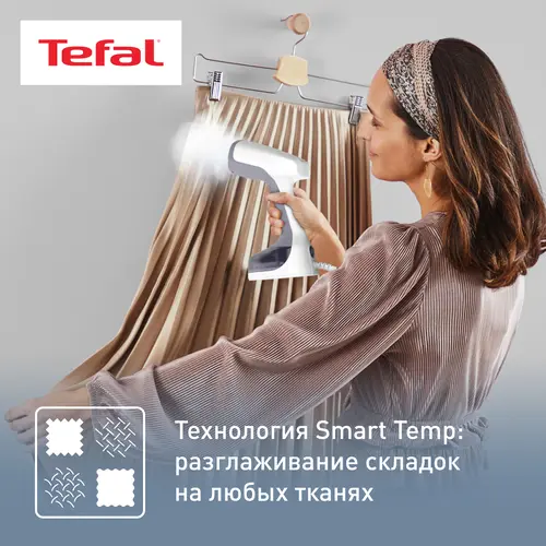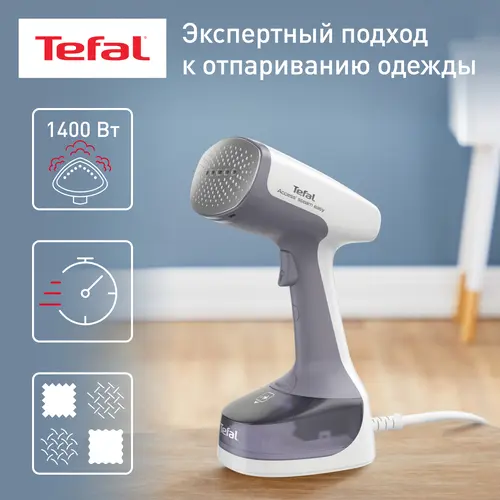 Отпариватель ручной Tefal Access Steam Easy DT7151E1 – удобное и компактное устройство серого цвета. Модель мощностью 1400 Вт нагревается в течение 15 сек, что позволяет быстро приступить к работе. Изделие используется для удаления складок на одежде, удобно для вертикального ухода за шторами или вещами на вешалках. Удобная ручка обеспечивает комфортную эксплуатацию без усталости. А крючок для двери в комплекте позволяет найти удобное место для использования устройства.