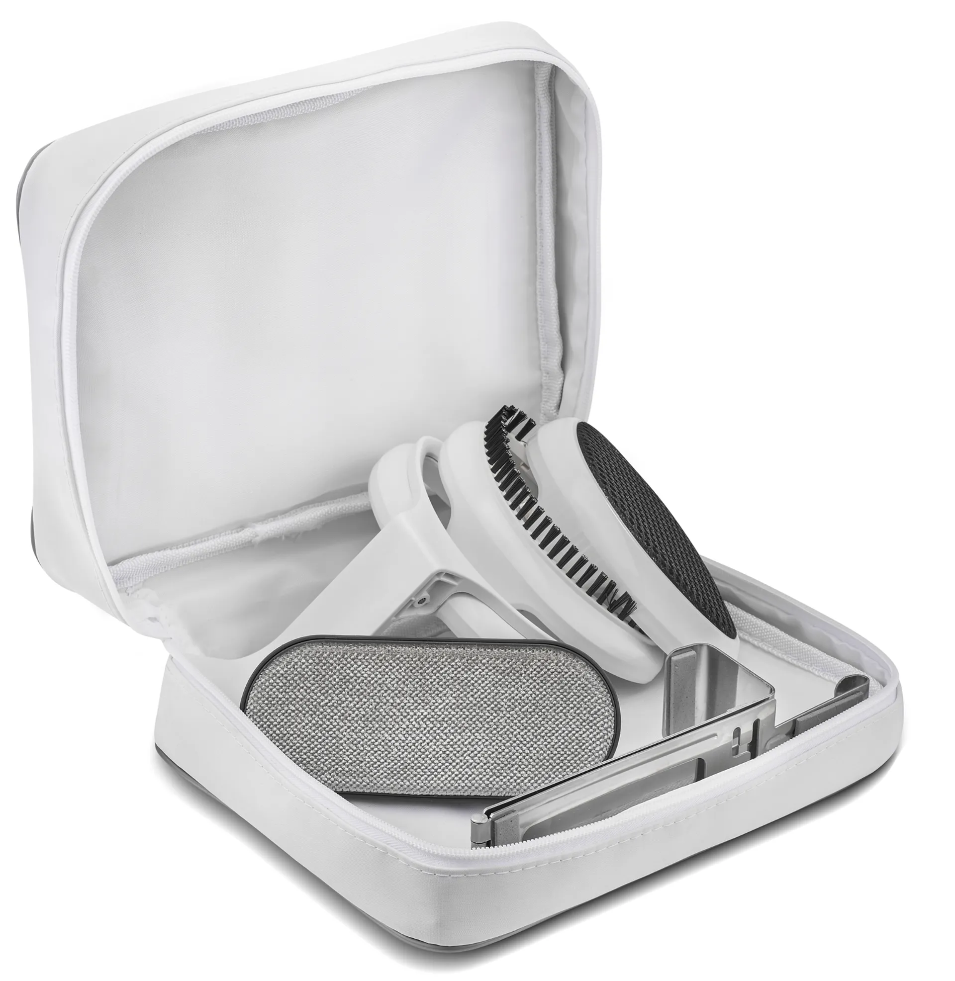 Щетка для плотной ткани, насадка для отпаривания деликатных тканей, насадка для создания стрелок, крючок для двери, насадка для удаления шерсти и пыли, чехол для хранения, вертикальная поддержка