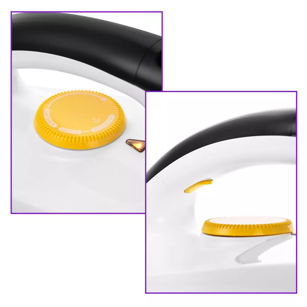 Регулятором настраивается температура нагрева подошвы утюга от 70 до 210 °C в зависимости от обрабатываемой ткани: Синтетика/Шёлк, Шерсть или Хлопок/Лён. Кнопка подачи пара удобно располагается на ручке парового утюга.