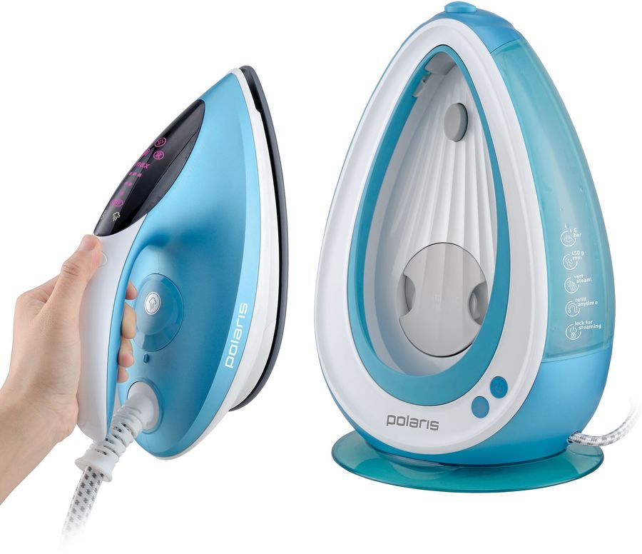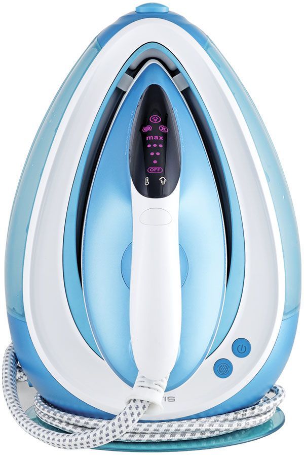 Особенности Электронное управление на ручке. Автоотключение при отсутствии воды. Замок для удобной переноски прибора. Удобная фиксация парового шланга и шнура на базе. Мощность 2400 Вт. Режимы работы: сухое глажение; мощность постоянного пара до 120 г/мин; вертикальное отпаривание.