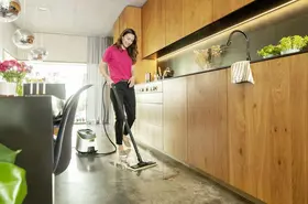 Мощный пароочиститель SC 4 Deluxe, давление пара на выходе которого достигает 4,0 бар, при чистке твердых поверхностей уничтожает до 99,99 % вирусов и распространенных в быту бактерий. Он оснащен съемным бачком, который может наполняться водой в любое время, что исключает неоправданные перерывы в работе. Очень большой встроенный отсек для принадлежностей позволяет удобно разместить насадки, кабель и шланг.