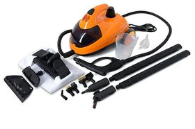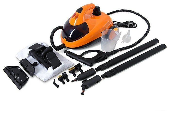 в комплекте: удлинительная трубка, переходник к щетке для пола, тряпка для пола, угловая насадка, вспомогательная насадка, круглая нейлоновая щетка маленькая, круглая нейлоновая щетка большая, мерная чашка, воронка, сигнализация отсутствия воды