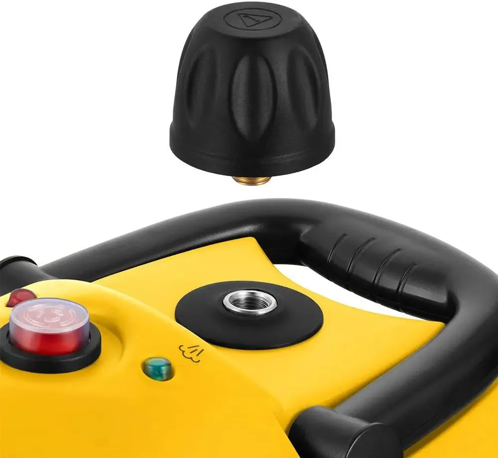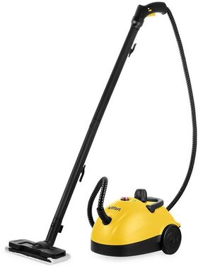 Управление пароочистителем механическое. Номинальная мощность прибора — 1500 Вт. Установлены индикаторы включения и готовности к работе. Длина сетевого шнура — 2,6 м. Цвет корпуса — черно-желтый. Вес составляет 3,86 кг. В комплект входит набор насадок, которые подходят для разных случаев уборки: для мытья полов, для отпаривания ткани, для сильных загрязнений, скребок, для мытья стекол, точечная насадка с щеткой, насадка для труднодоступных мест, тонкое сопло, изогнутое сопло, насадка-щетка.