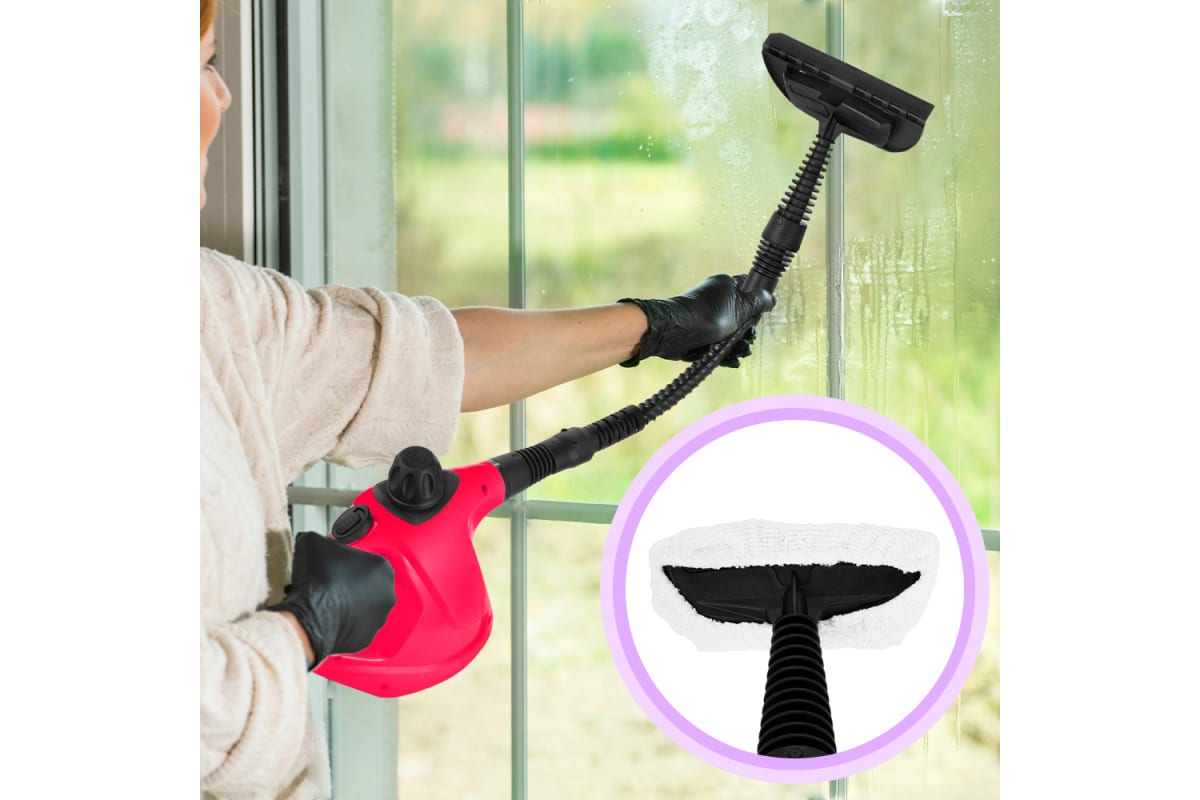 Пароочиститель очищает поверхности от пятен при помощи горячего пара, однако не все пятна могут быть удалены таким способом. В случаях серьезного загрязнения используйте нейлоновую круглую щетку, а также чистящие средства, которые надо наносить на загрязнения. Для очистки окон, зеркал и кафельной плитки используется насадка с резиновым скребком. Чтобы отпаривать одежду и чистить обивку мягкой мебели в комплекте есть тряпка для отпаривания, которая надевается на насадку для отпаривания. Благодаря наличию съемного парового шланга есть возможность очистить труднодоступные места. Угловая насадка справится с загрязнениями в таких труднодоступных местах, какуглы и радиаторы отопления.