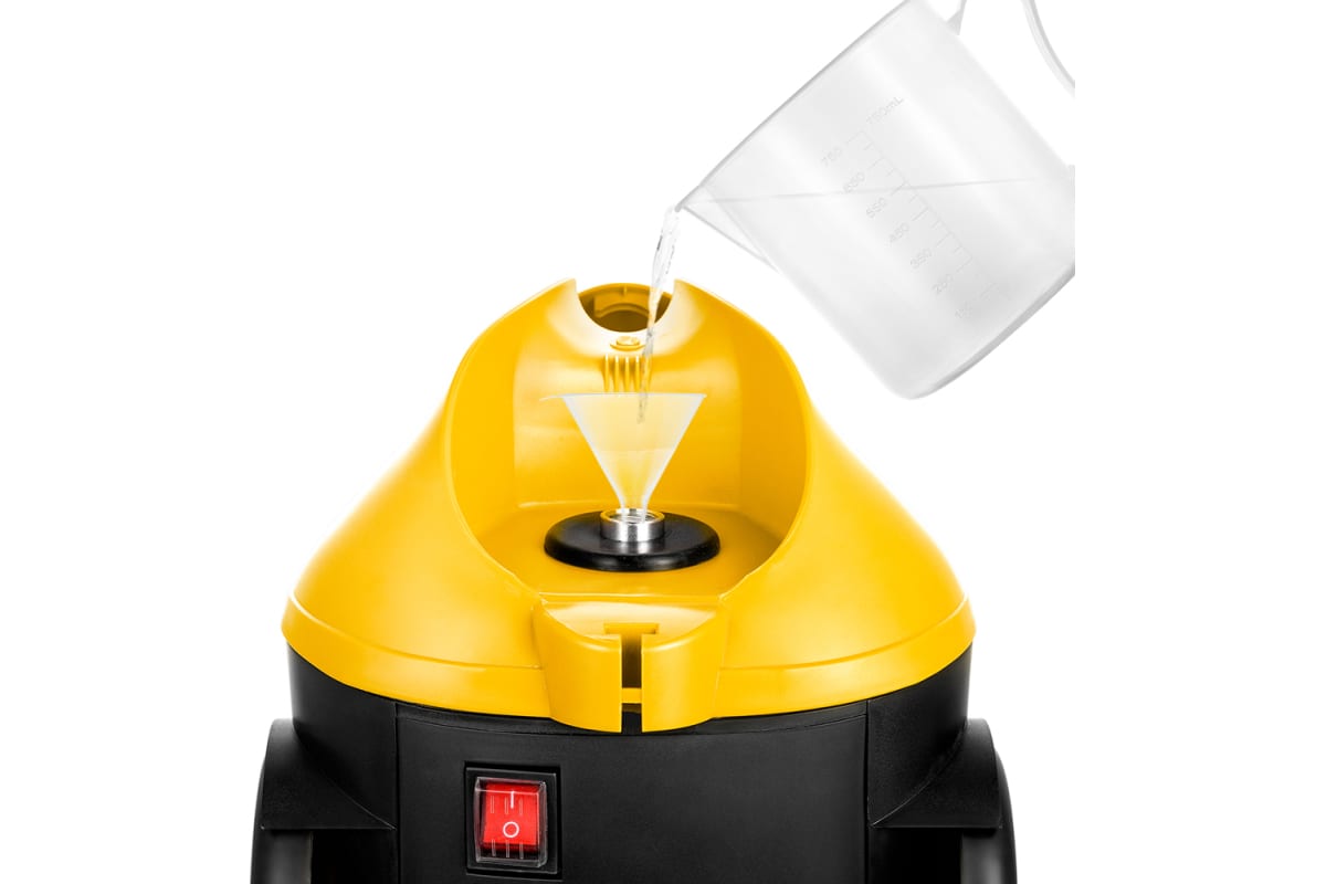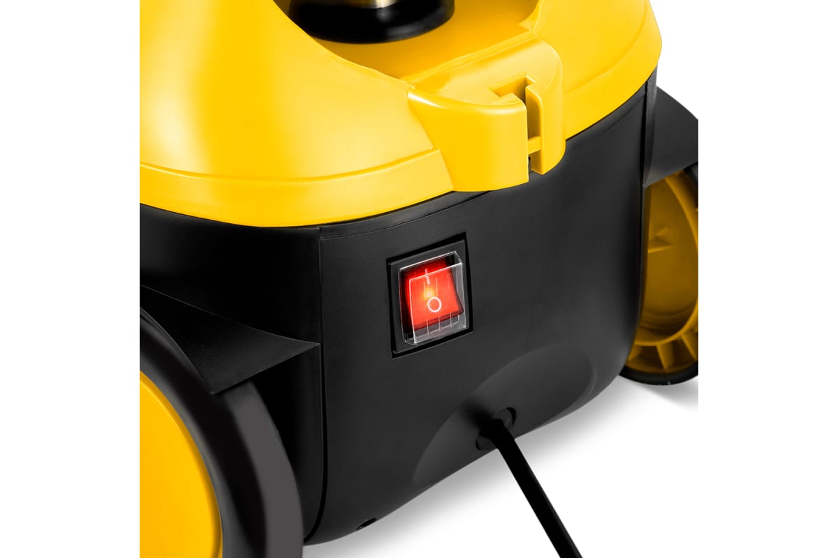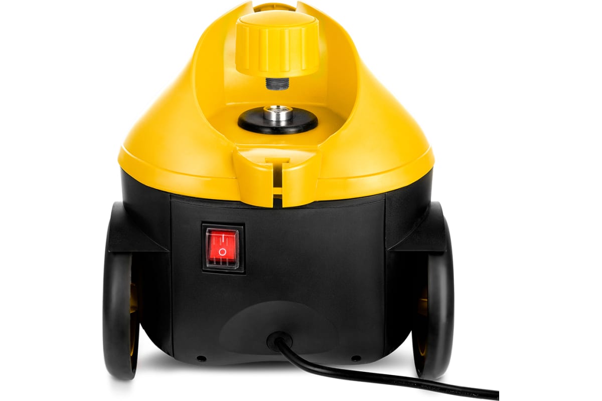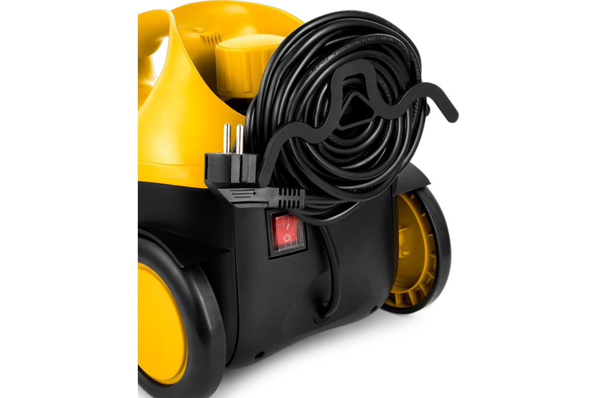 На корпусе пароочистителя есть ручка для переноса. Колеса позволяют с легкостью перемещать пароочиститель, не поднимая его. Паровой пистолет можно вставить в специальный отсек на корпусе пароочистителя для более удобного хранения прибора. Большое количество насадок в комплекте поможет очистить труднодоступные или сильнозагрязненные поверхности.