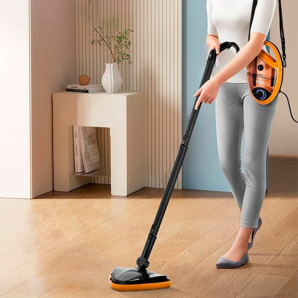 насадка для пола, насадка-зажим, насадка-скребок, большая круглая нейлоновая щетка, коническая нейлоновая щетка, малая круглая нейлоновая щетка, мерный стакан, насадка для отпаривания, рамка для ковра, тряпка для пола