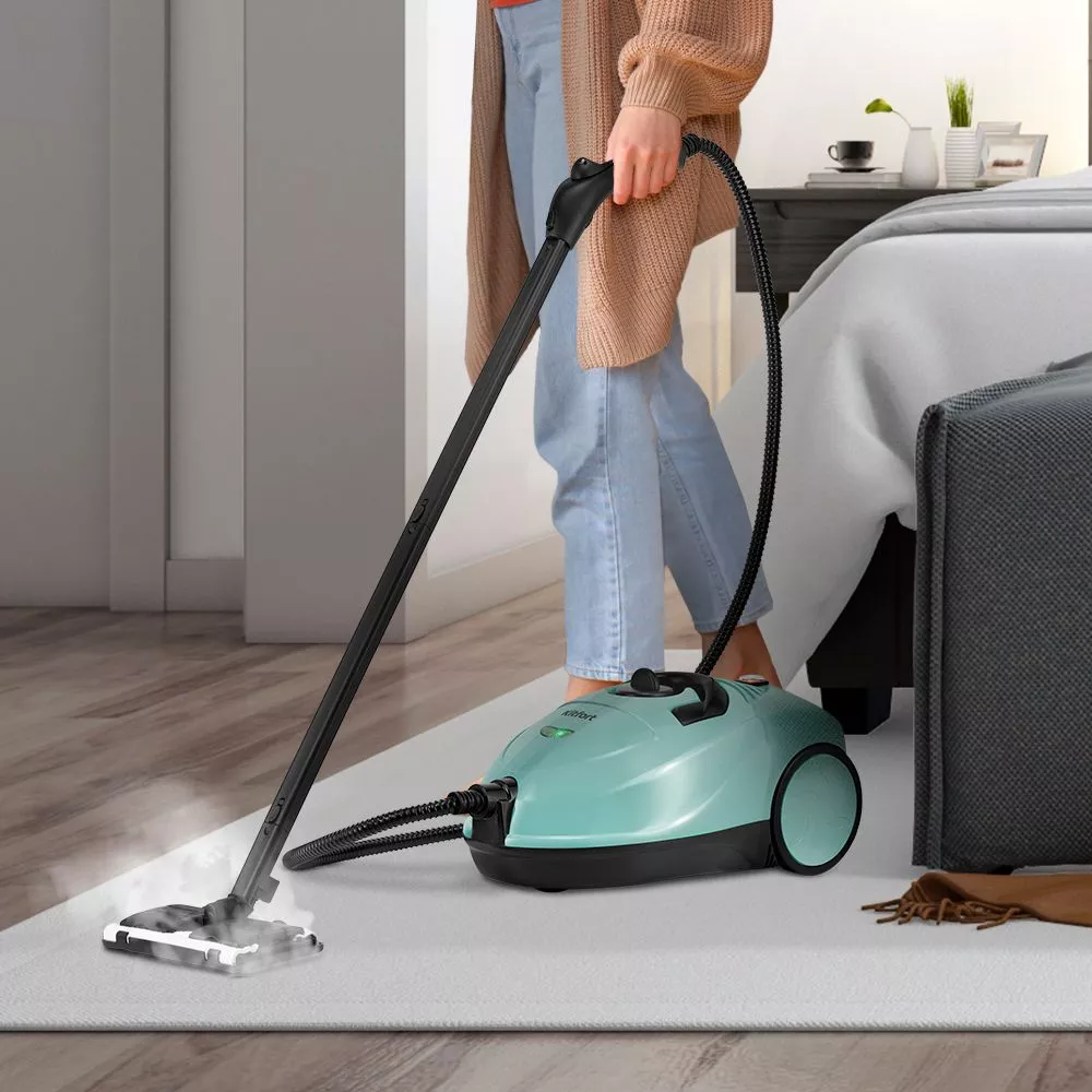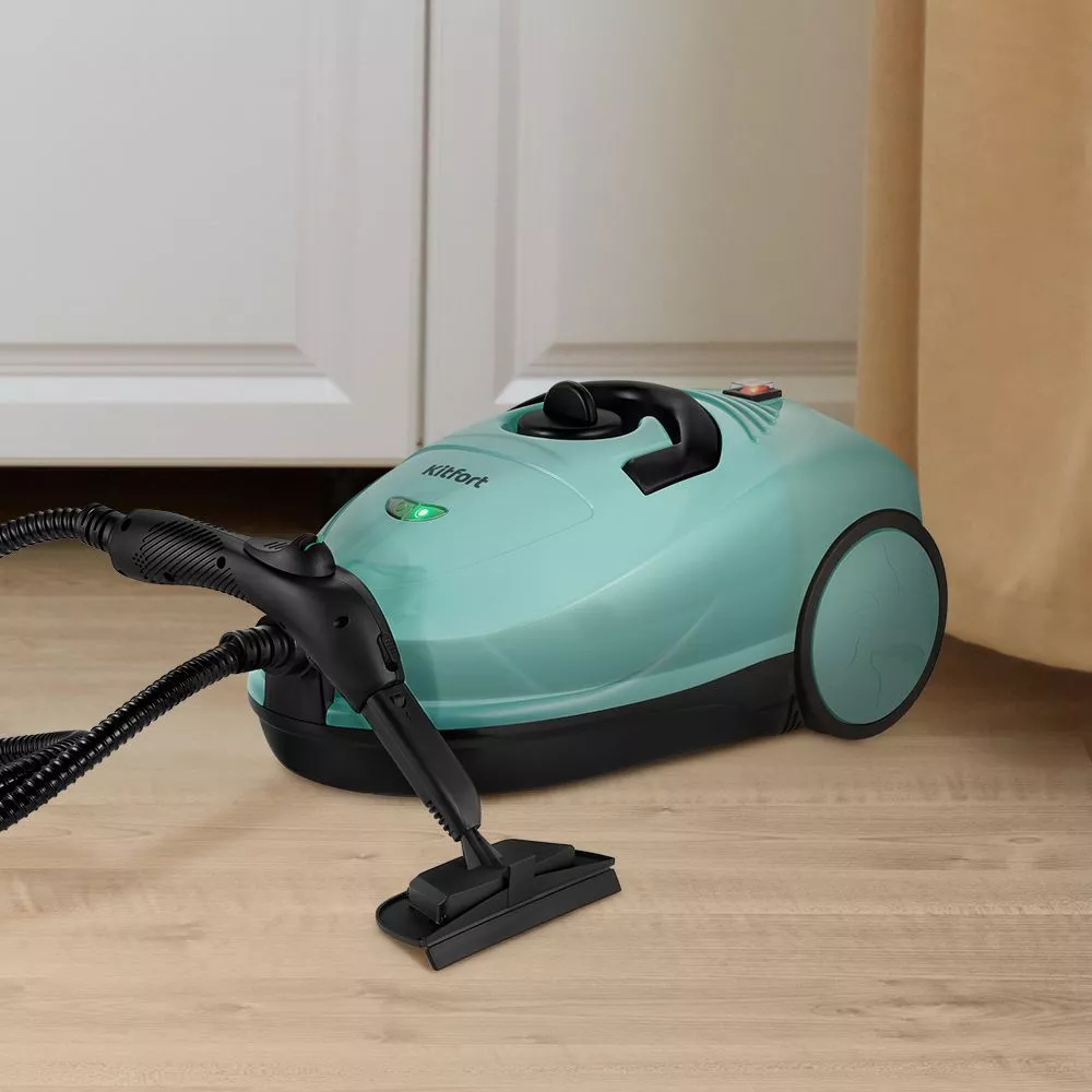 На корпусе пароочистителя есть ручка для переноски. Колёса позволяют с лёгкостью перемещать пароочиститель, не поднимая его. Пароочиститель КТ-9182 предназначен для уборки полов и поверхностей, находящихся как внутри, так и вне помещений.