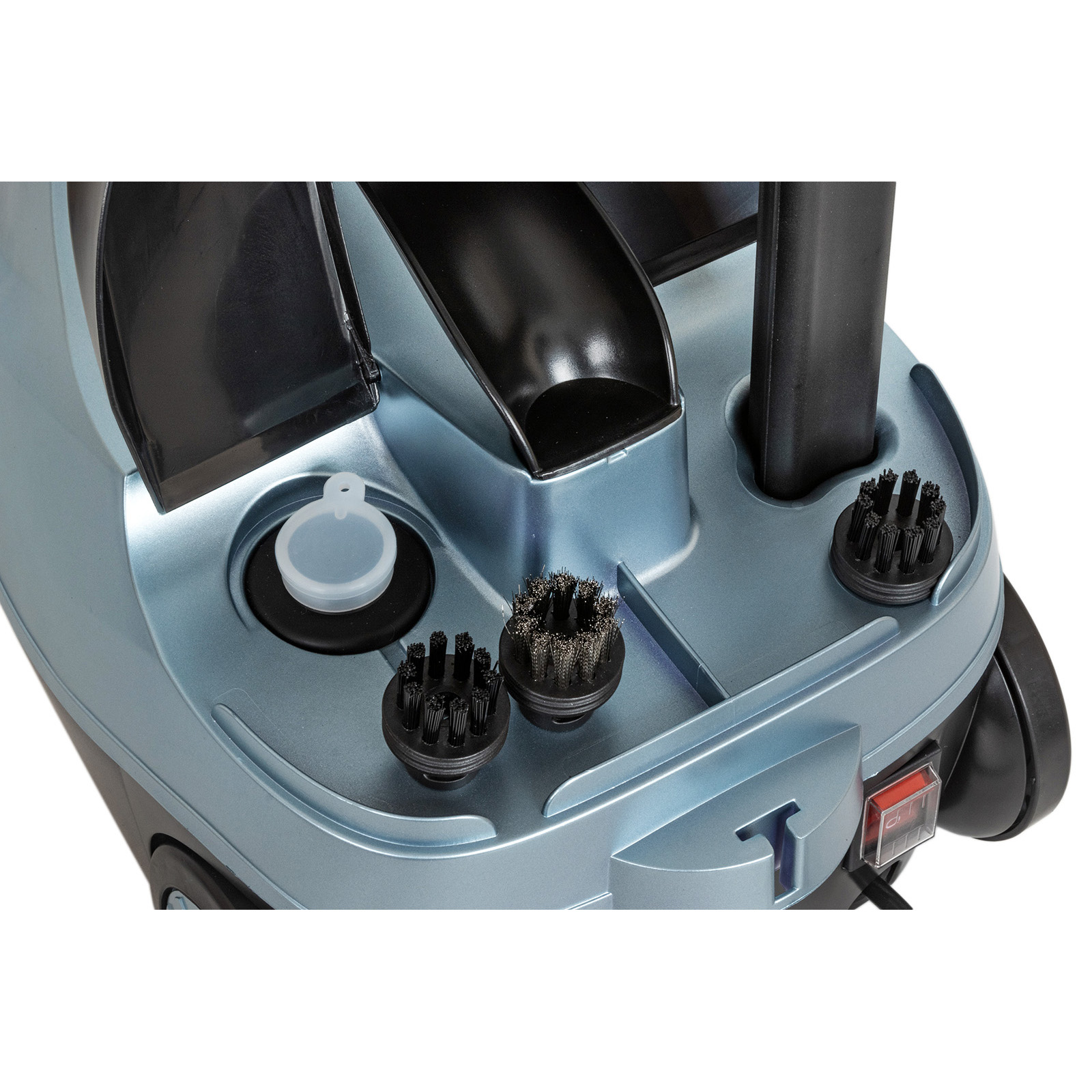 Комплектация: пароочиститель, мерный стакан, удлинительные трубки – 2 шт., плоская насадка для отпаривания, скребок для очистки стекол и зеркал, большая насадка, швабра, насадка на швабру для чистки ковров, держатель для смотки шнура питания, вешалка для одежды, круглая щетка металлическая, круглые щетки нейлоновые – 3 шт., текстильная насадка для отпаривания, текстильная насадка для швабры, гарантийный талон, инструкция на русском языке