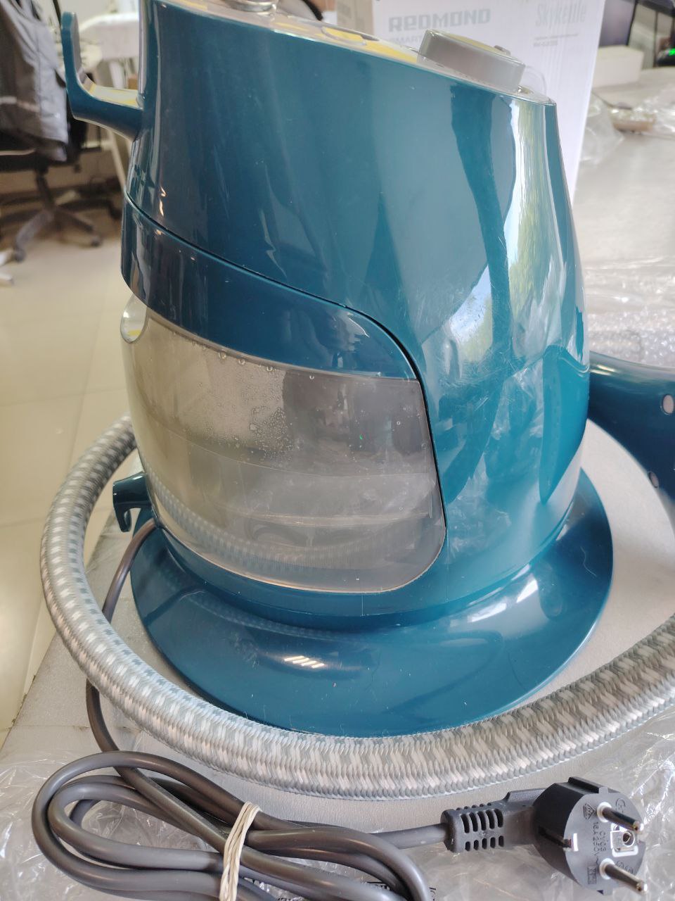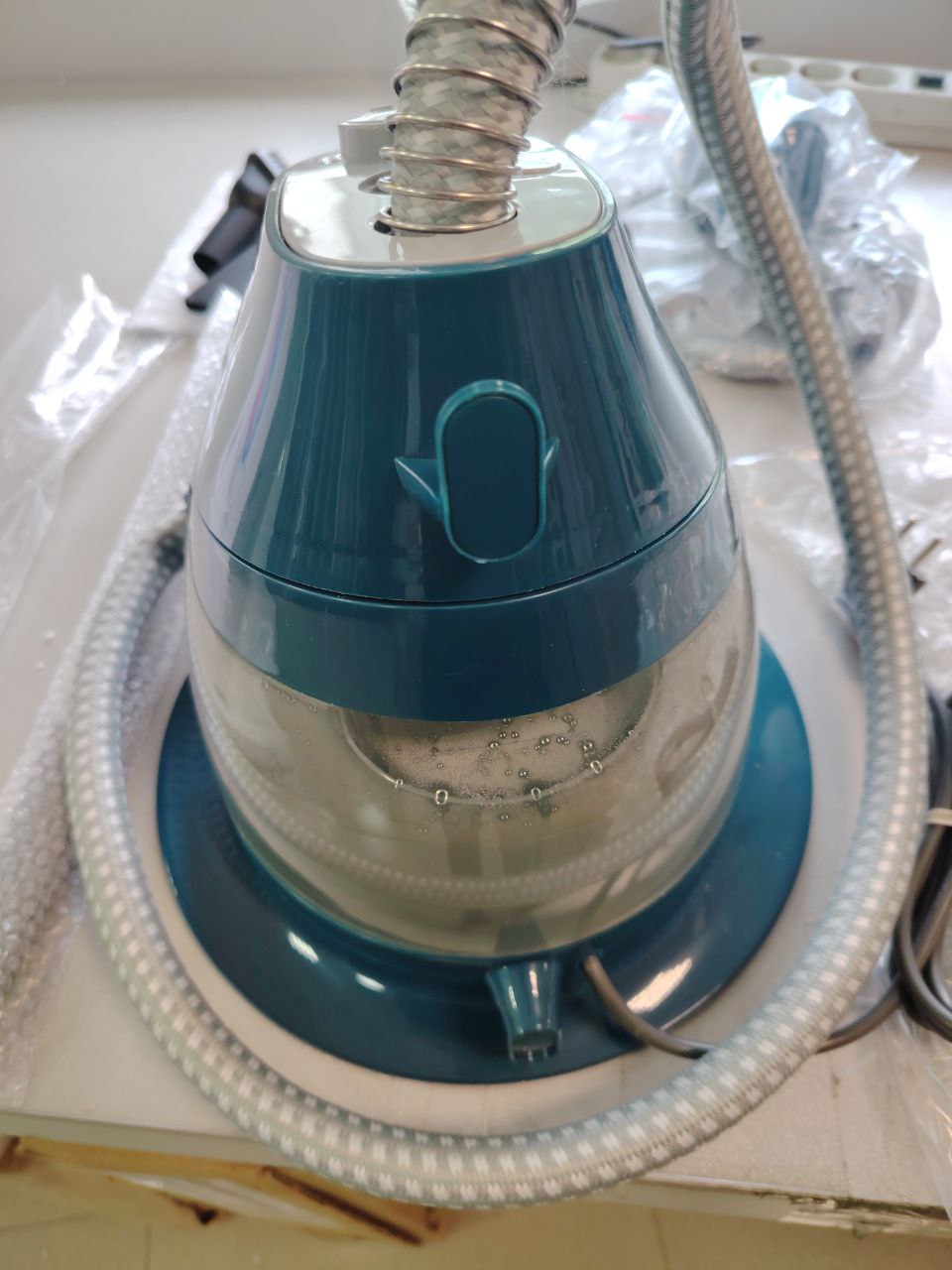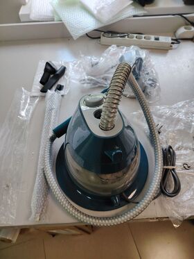 В комплекте: 4-х секционная телескопическая стойка 120 см., теплоизоляционный шланг с утюжком, насадка-щетка, вешалка для одежды, держатели для брюк, контейнер для воды, теплоизолированная рукавица