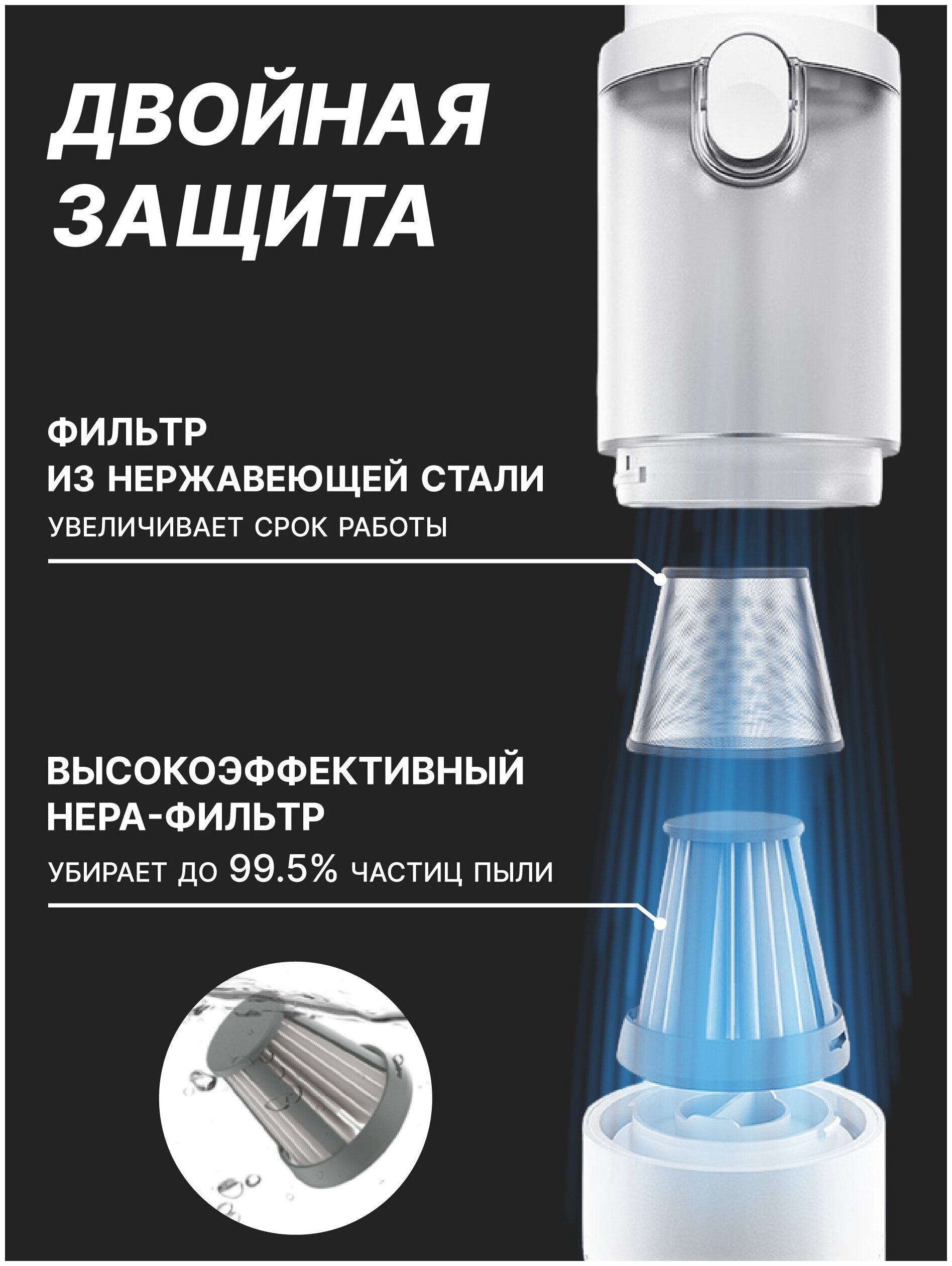 Описание Lydsto Handheld Vacuum Cleaner H1 White (YM-SCXCH101) – ручной пылесос, благодаря компактному размеру которого, уборка превратится в удовольствие. Продуманная конструкция: кнопка блокировки пылесборника, всего одно нажатие и пылесборник готов к отчистке. Фильтр из нержавеющей стали для отделения крупных частиц пыли. Встроенный высокоэффективный фильтр нера. Низкий уровень шума. Бесщёточный двигатель постоянного тока с максимальной мощностью всасывания до 5000 Па. Справится с пылью, сажа, волосы, остатки картофельных чипсов и тд. Конструкция пылесоса имеет изысканный внешний вид, простую конструкцию и лёгкий вес. Не занимает много места , поместится даже в небольших отсеках вашего автомобиля. Универсальный интерфейс Type-C совместим с большинством кабелей для зарядки мобильных телефонов и цифровой техники.