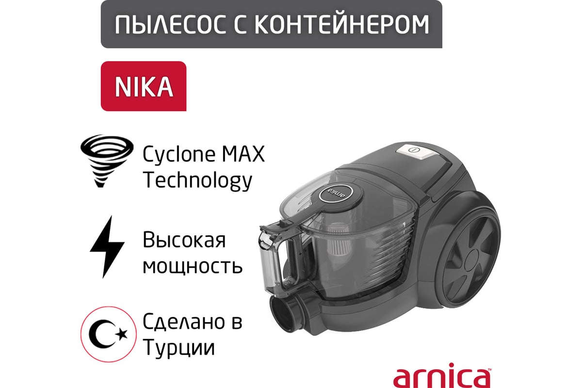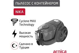 Пылесос Arnica Nika благодаря высокой мощности всасывания и циклонной технологии Cyclone MAX обеспечивает качественные результаты уборки в помещении. Для сбора мусора используется контейнер объемом 2.5 литров, который при необходимости легко извлекается и очищается. В наборе с пылесосом предусмотрены универсальная насадка для напольных/ковровых покрытий и насадка для уборки в труднодоступных местах. Металлическая телескопическая трубка, переносная ручка и сетевой кабель длиной 6 метров гарантируют комфорт в процессе эксплуатации пылесоса Arnica Nika.