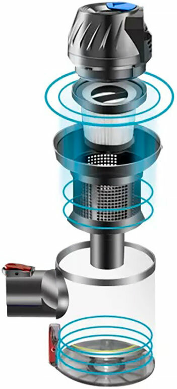 Особенности 2 в 1 вертикальный и компактный Циклоническая система сбора пыли Мощность 150 Вт 2 режима работы Фильтр HEPA H11 Время непрерывной работы до 35 мин. Аккумулятор Li-ion 2200 мАч, 22.2 В Поворотная щетка с LED подсветкой Низкий уровень шума эффективное очищение Четырехступенчатая система фильтрации с моющимся HEPA H11 фильтром обеспечивает надежное задержание пыли внутри пылесоса. Воздух в помещении становится чище, чем был до уборки, и меньше пыли оседает на мебели.