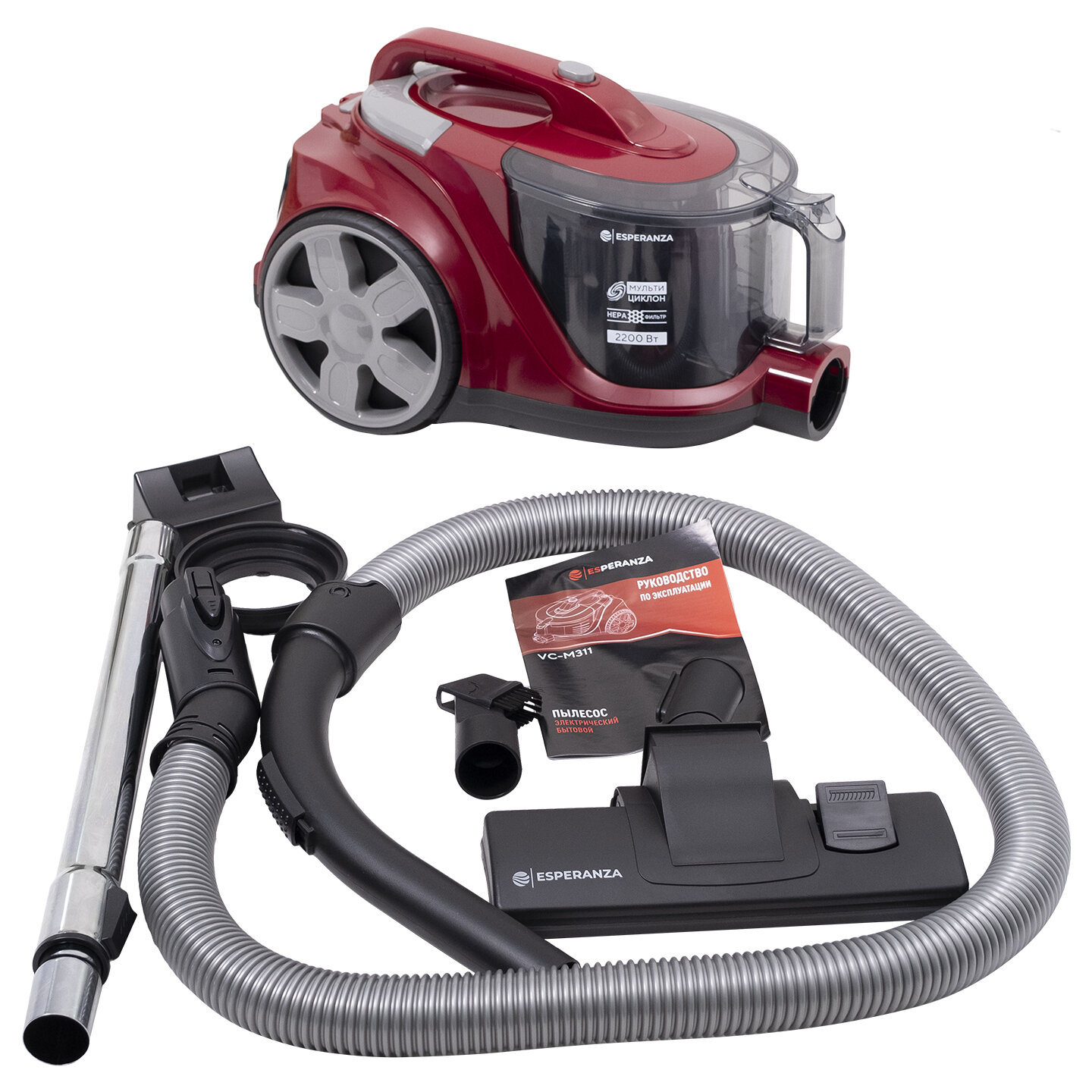 Комплектация: пылесос с установленными фильтрами и контейнером-пылесборником, шланг, металлическая телескопическая трубка, универсальная щетка пол/ковер, щелевая насадка, насадка для мебели, руководство по эксплуатации с гарантийным талоном, коробка