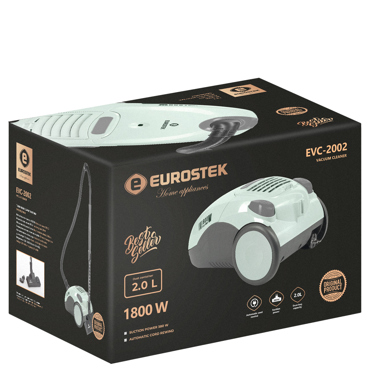 Пылесос с тканевым пылесборником Eurostek EVC-2002 Максимальная мощность 1800 Вт., мощность всасывания 380 Вт., телескопическая металлическая трубка и щетка для пола, объем пылесборника составляет 2 литра, защита от перегрева, автоматическая смотка шнура.